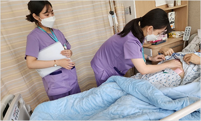 입원생활의 만족도를 높이기 위해 각 부서 파트장이 라운딩을 하며 환자의 불안을 감소시킵니다.